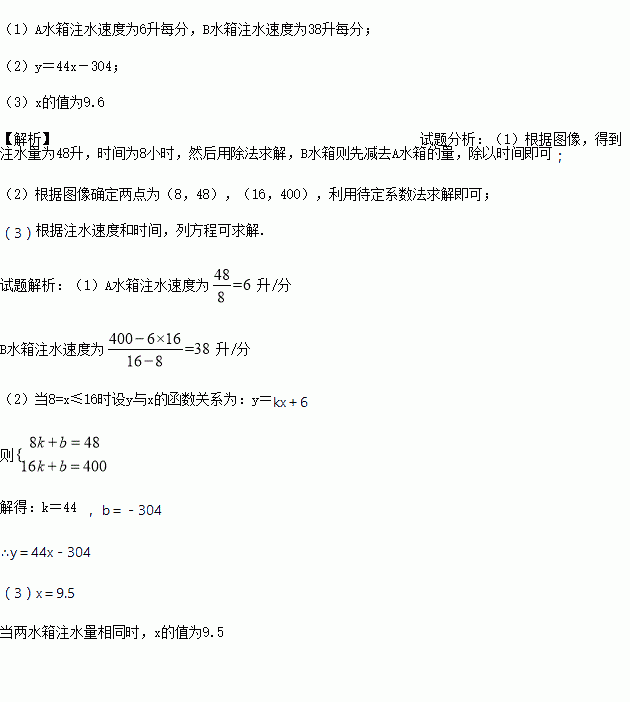 一个容积为400升的水箱,安装两个有A、B进水管向水箱注水,注水过程中A水管始终打开,两水管进水的速度保持不变,当水箱注满时,两水管自动停止注水,注水过程中水箱中水量y(升)与A管注水时间x(分)之间的函数图象如图所示.