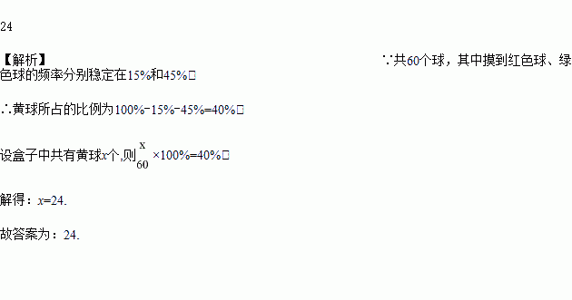 在一个纸箱中,装有红色、黄色、绿色的塑料球共60个.这些小球除颜色外其他都完全相同,将球充分摇匀后,从中随机摸出一个球,记下它的颜色后再放回箱中,不断重复这一过程,小明发现其中摸到红色球、绿色球的频率分别稳定在0.15和0.45,则这个纸箱中黄色球的个数可能有________个.