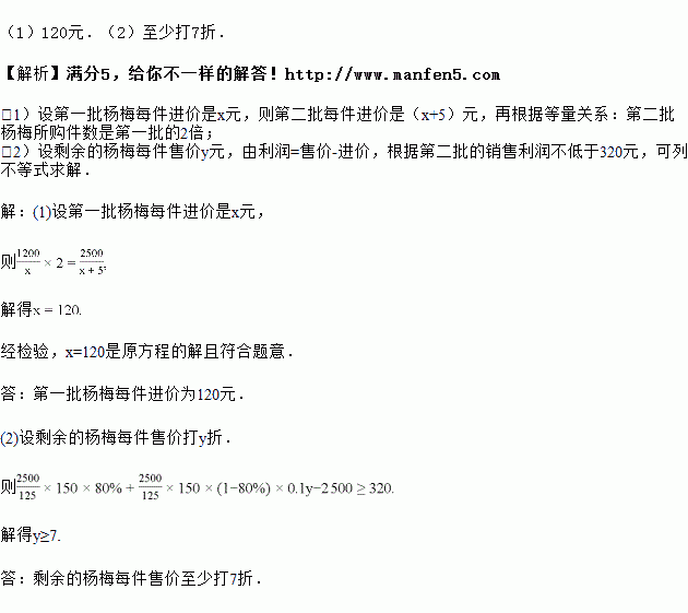 (2)老板以每件150元的价格销售第二批杨梅,售出80%后,为了尽快售完,决定打折促销,要使第二批杨梅的销售利润不少于320元,剩余的杨梅每件售价至少打几折?(利润=售价-进价)