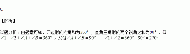 如图,△ABC为直角三角形,∠C=90°,若沿图中虚线剪去∠C,则∠1+∠2= ( )