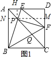 分析 过P点作MN⊥AB,交DC于M,交AB于N,作PH⊥AD于H,由正方形的性质得AB=AD,AN=AH,则BN=HD,而HD=PM,所以BN=PM,接着证明△BPN≌△PFM得到PB=FB,于是可判断△PBF为等腰直角三角形,所以∠PBF=45°,则可对①进行判断;延长DC到E′,使CE′=AE,连结BE′,如图,先证明△ABE≌△CBE′得到BE=BE′,∠ABE=∠CBE′,再证明∠E′BF=45°,则可根据“SAS”判断△BEF≌△BE′F,得到EF=E′F,则EF=AE+FC,利用等线段代换可得△DEF的周长=AD+DC=8,则可对②进行判断;在BE′截取BP′=BP,连结CP′,QP′,易证得△BAP≌△BCP′,得到∠BAP=∠BCP′=45°,AP=CP′,所以∠QCP′=90°,然后证明△BPQ≌△BP′Q得到PQ=P′Q,再在Rt△QCP′中根据勾股定理得CP′2+CQ2=P′Q2,利用等线段代换即可得到AP2+CQ2=PQ2,则可对③进行判断;在Rt△BFC中,利用勾股定理计算出BF=2$\sqrt{5}$,然后根据△PBF为等腰直角三角形可得PF=$\frac{\sqrt{2}}{2}$BF=$\sqrt{10}$,于是可对④进行判断.