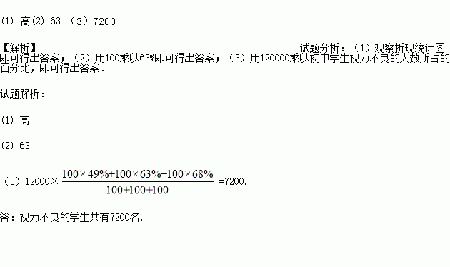 为了解某市12000名初中学生的视力情况,该校数学兴趣小组从该市七、八、九年级各随机抽取了100名学生进行调查,整理他们的视力情况数据,得到如下的折线统计图.