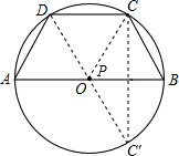 分析:作出点C关于AB的对称点C′,连接C′D,根据轴对称确定最短路线问题,C′D与AB的交点即为所求的点P,连接CP,根据同弧所对的圆周角等于圆心角的一半求出∠B=60°,然后求出AB∥CD,再求出∠BCD=120°,再求出∠BCC′=30°,然后求出∠C′CD=90°,从而判断出C′D为圆的直径.