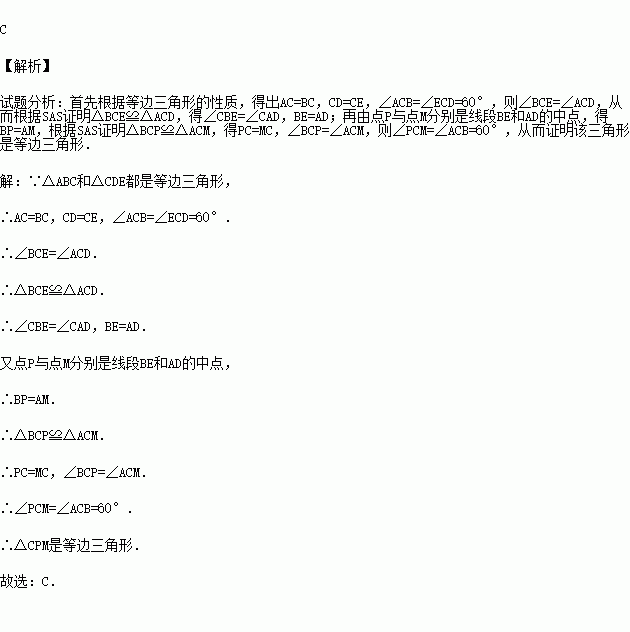 (2015•黄冈中学自主招生)如图,在线段AE同侧作两个等边三角形△ABC和△CDE(∠ACE<120°),点P与点M分别是线段BE和AD的中点,则△CPM是( )