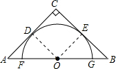 ∵半圆O与等腰直角三角形两腰CA、CB分别切于D、E两点,