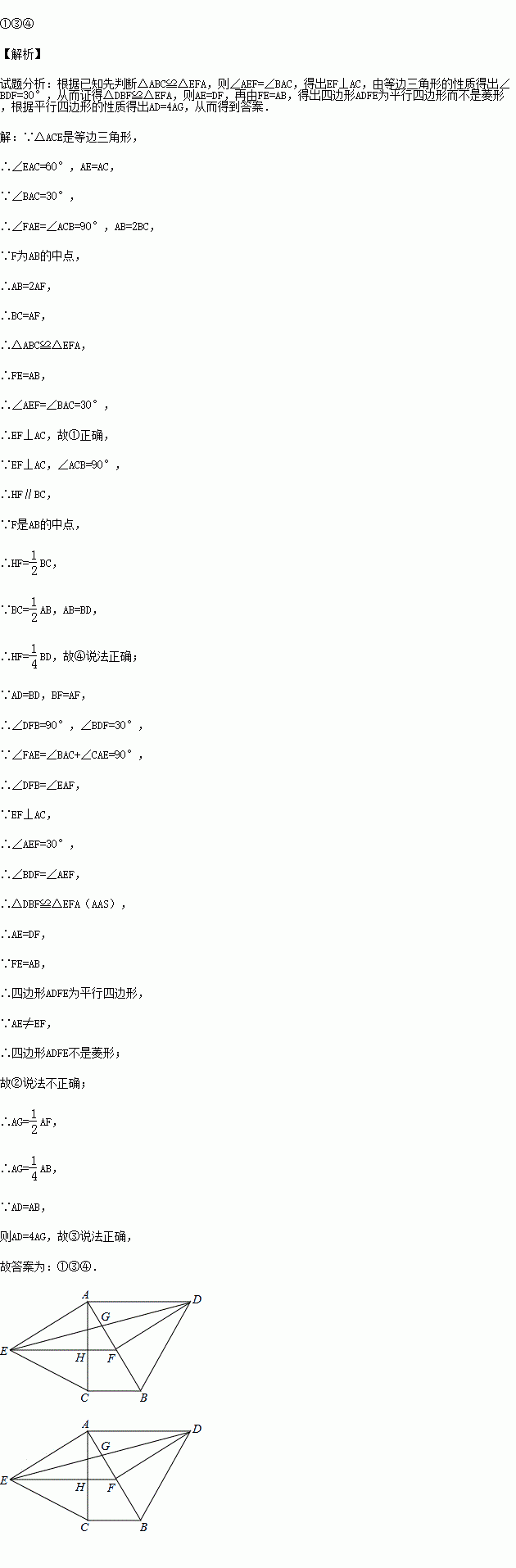 如图,分别以直角△ABC的斜边AB,直角边AC为边向△ABC外作等边△ABD和等边△ACE,F为AB的中点,DE与AB交于点G,EF与AC交于点H,∠ACB=90°,∠BAC=30°.给出如下结论: