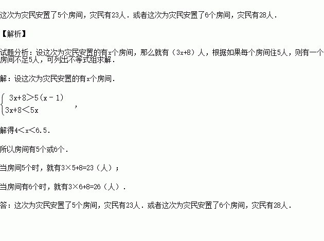 四川5•12大地震中,一批灾民要住进“过渡安置”房,如果每个房间住3人,则多8人,如果每个房间住5人,则有一个房间不足5人,问这次为灾民安置的有多少个房间?这批灾民有多少人?