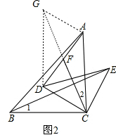 (2)延长CF到G使FG=CF,连结AG、DG,如图2,易得四边形ACDG为平行四边形,则AG=CD,AG∥CD,于是根据平行线的性质得∠GAC=180°-∠ACD,所以CD=CE=AG,再根据旋转的性质得∠BCD=α,所以∠BCE=∠DCE+∠BCD=90°+α=90°+90°-∠ACD=180°-∠ACD,得到∠GAC=∠ECB,接着可证明△AGC≌△CEB,得到CG=BE,∠2=∠1,所以BE=2CF,和前面一样可证得CF⊥BE.