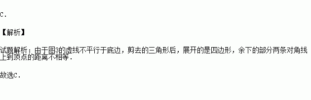 如图(1),小强拿一张正方形的纸,沿虚线对折一次得图(2),再对折一次得图(3),然后用剪刀沿图(3)中的虚线剪去一个角,再打开后的形状是 ( )