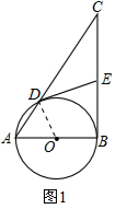 分析:(1)连接OD,根据切线的性质可得∠ODE=90°,则∠CDE+∠ADO=90°,由AB=6,BC=8,AC=10根据勾股定理的逆定理可证得∠ABC=90°,则∠A+∠C=90°,根据圆的基本性质可得∠A=∠ADO,即可得到∠CDE=∠C,从而证得结论;