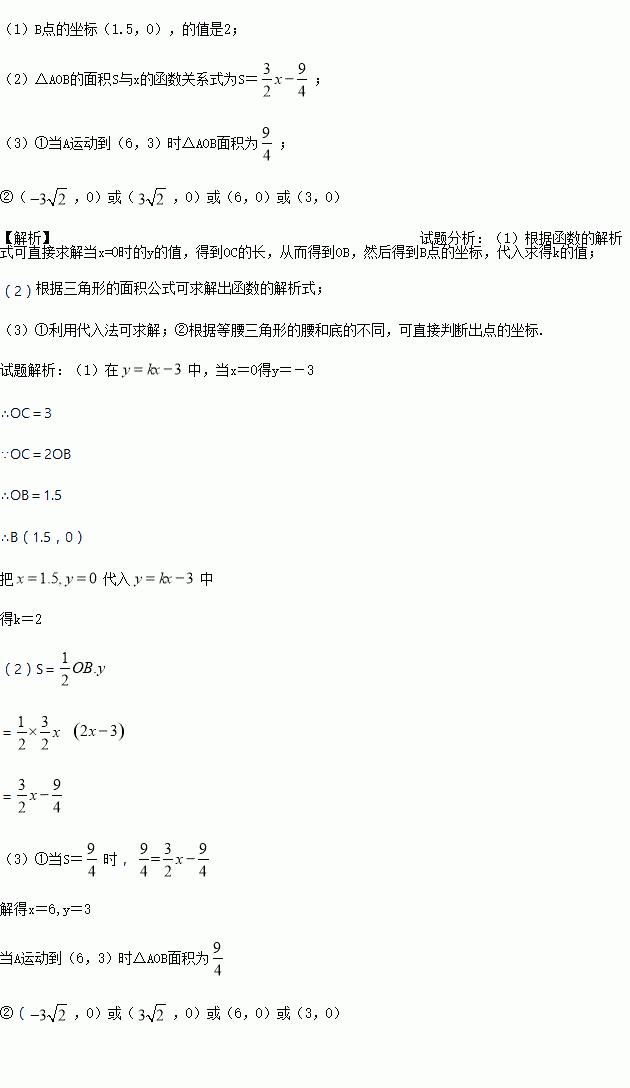 (2)若点A(x,y)是直线y=kx-3上在第一象限内的一个动点,当A 在运动的过程中,试写出△AOB的面积S与x的函数关系式,(不要求写出自变量的取值范围).