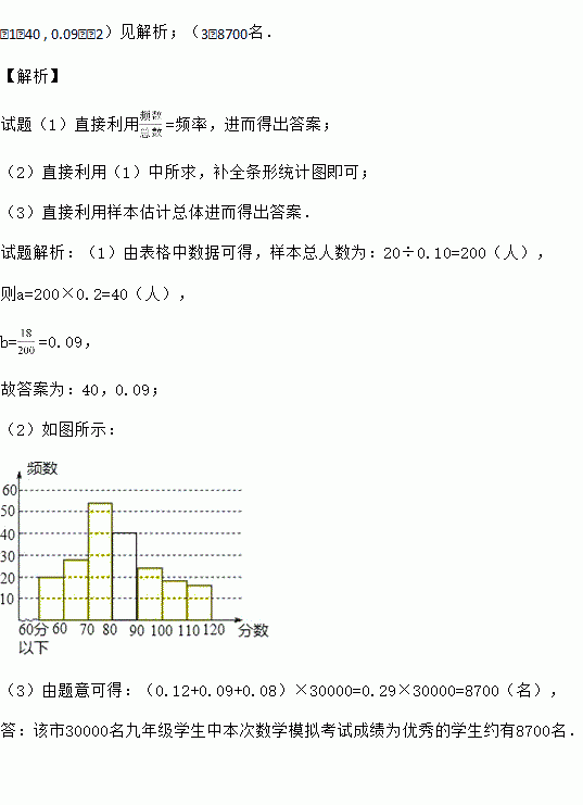(3)如果把成绩在90分以上(含90分)定为优秀,那么该市30000名九年级学生中本次数学模拟考试成绩为优秀的学生约有多少名?