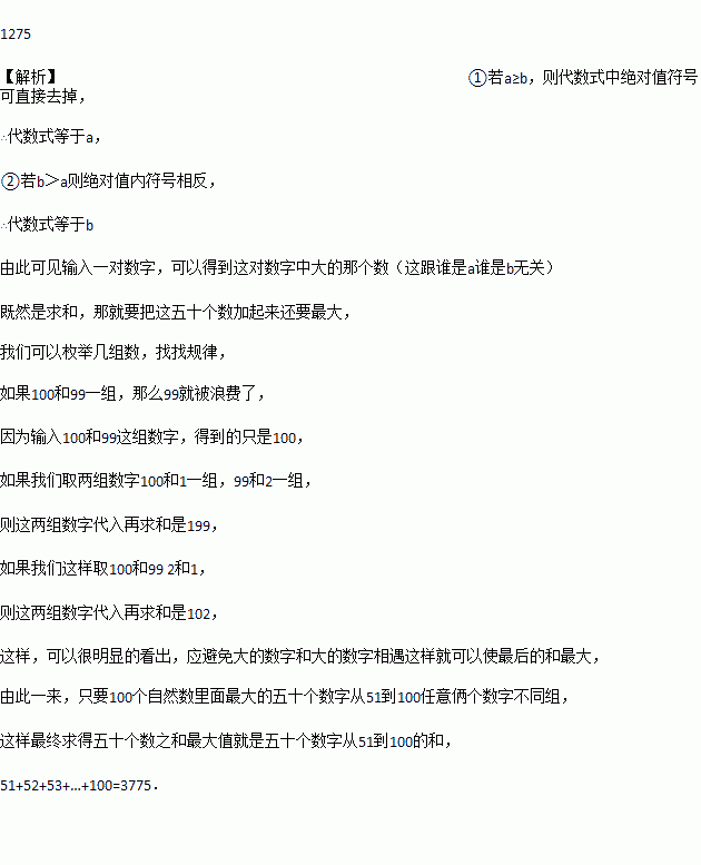 将1,2,3,……,100这100个自然数,任意分为50组,每组两个数,现将每组的两个数中任一数值记作a,另一个记作b,代入代数式