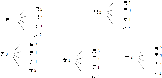 分析 设三名男生记为男1,男2,男3,2名女生记为女1,女2,依据题意先用列表法或画树状图法分析所有等可能的出现结果,然后根据概率公式求出该事件的概率.