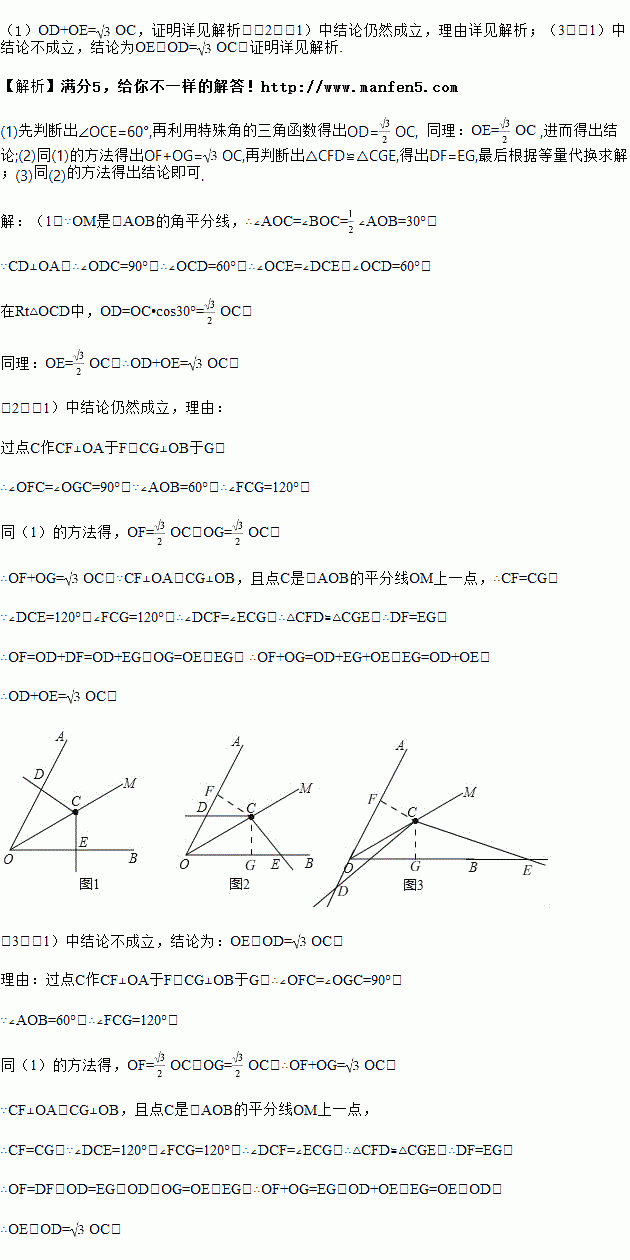 如图,已知∠AOB=60°,在∠AOB的平分线OM上有一点C,将一个120°角的顶点与点C重合,它的两条边分别与直线OA、OB相交于点D、E.