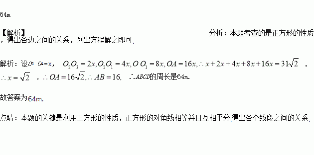 如图,是由两个正方形组成的长方形花坛ABCD,小明从顶点A沿着花坛间小路直到走到长边中点O,再从中点O走到正方形OCDF的中心O1,再从中心O1走到正方形O1GFH的中心O2,又从中心O2走到正方形O2IHJ的中心O3,再从中心O3到正方形O3KJP的中心O4,一共走了31