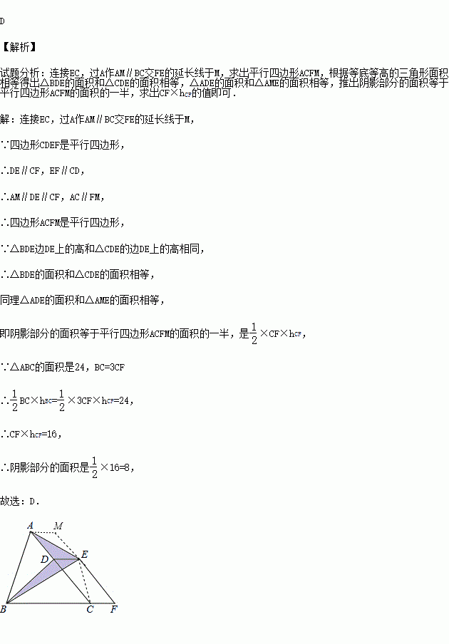 如图,已知△ABC的面积为24,点D在线段AC上,点F在线段BC的延长线上,且BF=4CF,四边形DCFE是平行四边形,则图中阴影部分的面积为( )