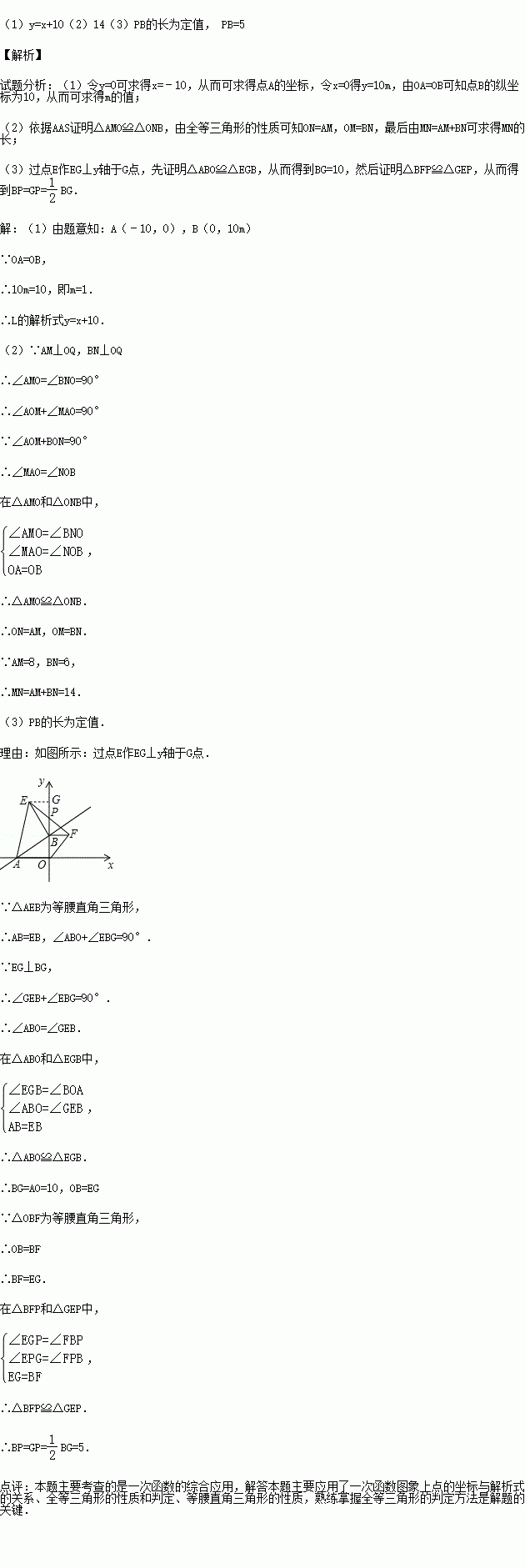 (3)当m取不同的值时,点B在y轴正半轴上运动,分别以OB、AB为边,点B为直角顶点在第一、二象限内作等腰直角△OBF和等腰直角△ABE,连EF交y轴于P点,如图③.