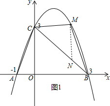 (2)过M点作MN∥y轴交BC于N,如图1,利用待定系数法求出直线BC的解析式为y=-x+3,设M(t,-t2+2t+3)(0<t<3),则N(t,-t+3),则可表示出MN=-t2+3t,利用三角形面积公式得到S△BMC=$\frac{1}{2}$MN•3=$\frac{3}{2}$(-t2+3t)=-$\frac{3}{2}$t2+$\frac{9}{2}$,然后根据二次函数的性质求解;