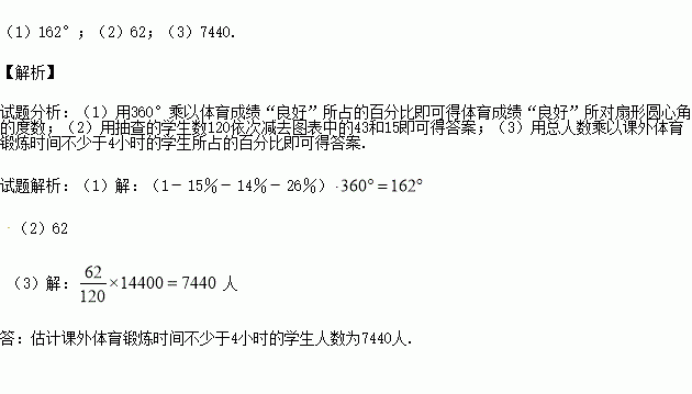 (3)全市初三学生中有14400人的体育测试成绩为“优秀”和“良好”,请估计这些学生中课外体育锻炼时间不少于4小时的学生人数.