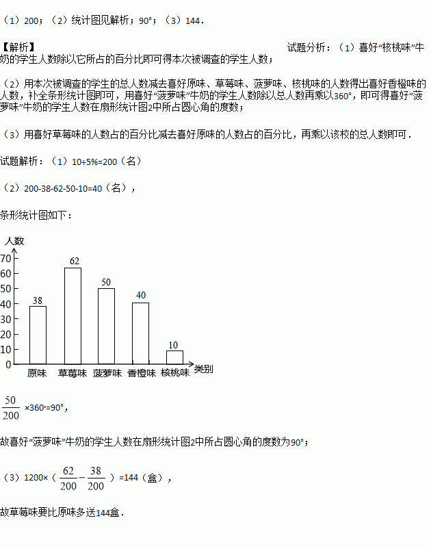 (3)该校共有1200名学生订购了该品牌的牛奶,牛奶供应商每天只为每名订购牛奶的学生配送一盒牛奶.要使学生每天都喝到自己喜好的口味的牛奶,牛奶供应商每天送往该校的牛奶中,草莓味要比原味多送多少盒?