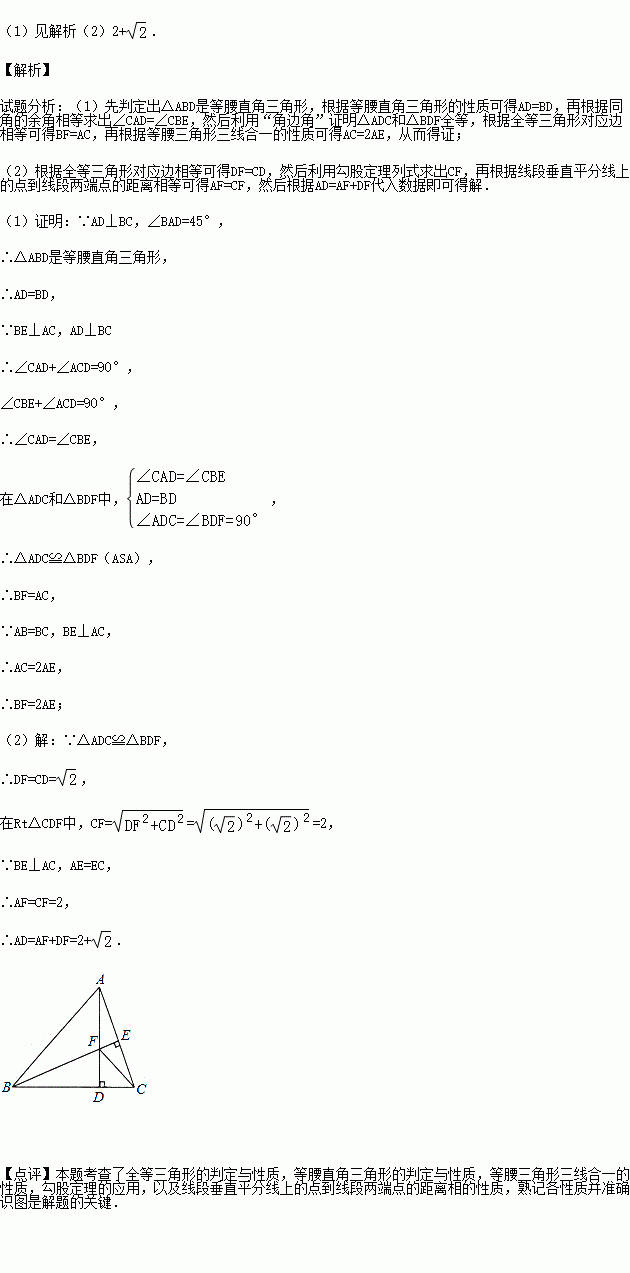如图,△ABC中,AB=BC,BE⊥AC于点E,AD⊥BC于点D,∠BAD=45°,AD与BE交于点F,连接CF.