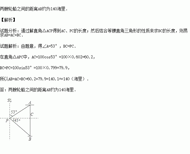 如图,一艘货轮位于灯塔P北偏东53°方向,距离灯塔100海里的A处,另一艘客轮位于货轮正南方向,且在灯塔P南偏东45°方向的B处,求此时两艘轮船之间的距离AB.(结果精确到1海里)