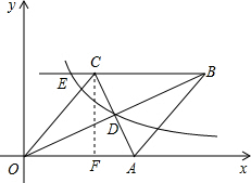 分析 过点C作CF⊥x轴于点F,由OB•AC=160可求出菱形的面积,由A点的坐标为(10,0)可求出CF的长,由勾股定理可求出OF的长,故可得出C点坐标,对角线OB、AC相交于D点可求出D点坐标,用待定系数法可求出双曲线y=$\frac{k}{x}$(x>0)的解析式,由反比例函数的解析式与直线BC的解析式联立即可求出E点坐标;由sin∠COA=$\frac{CF}{OC}$可求出∠COA的正弦值;根据A、C两点的坐标可求出AC的长,由OB•AC=160即可求出OB的长.