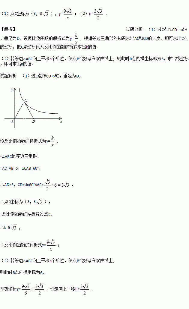 (2)将等边△ABC向上平移n个单位,使点B恰好落在双曲线上,求n的值.