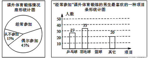 (3) 该校共有1200名男生,请估计全校男生中经常参加课外体育锻炼并且最喜欢的项目是篮球的人数