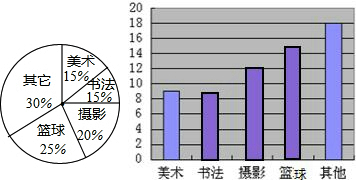 (3)书法参加人数为60×10%=6,参加摄影人数为:60×20%=12,参加篮球的人数为:60×25%=15.![]()