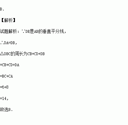 如图,在Rt△ABC中,∠C=90°,直线DE是斜边AB的垂直平分线交AC于D.若AC=8,BC=6,则△DBC的周长为( )
