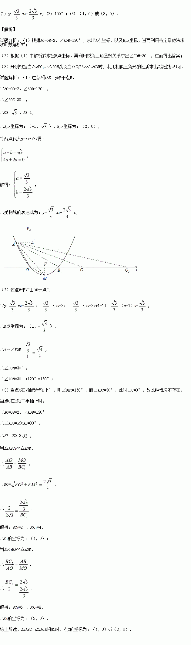 如图,在平面直角坐标系xOy中,顶点为M的抛物线y=ax2+bx(a>0)经过点A和x轴正半轴上的点B,AO=BO=2,∠AOB=120°.
