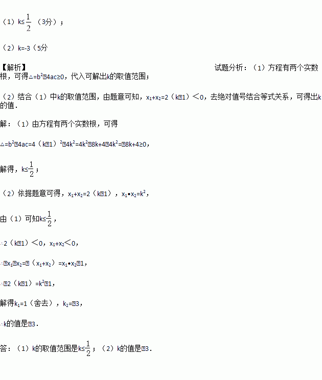 已知关于x的方程x2﹣2(k﹣1)x+k2=0有两个实数根x1,x2.