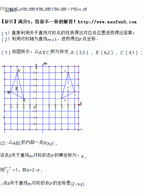 (1)在图中作出△ABC关于直线m对称的△A′B′C′,并写出A′、B′、C′三点的坐标(2)猜想:坐标平面内任意点P(x,y)关于直线m对称点P′的坐标为 .