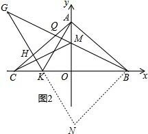 (3)如图2,若M为线段OA上一点,BM交AC于Q,过A作AK⊥BQ交BC于K,过K作KH⊥CM交AC于H,交BQ的延长线于G,问:若∠MBO=30°,试判断线段BG,BM,BK之间的关系.