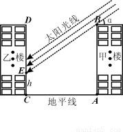 (2) 当α=30°时,甲楼楼顶B点的影子落在乙楼的第几层?若α每小时增加15°,从此时起几小时后甲楼的影子刚好不影响乙楼采光 ?