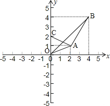 解答 解:如图,△OAB的面积为:4×4×$\frac{1}{2}$-1×2×$\frac{1}{2}$-(1+4)×2×$\frac{1}{2}$=2,△OAC的面积为:2×2×$\frac{1}{2}$=2.点C的坐标为(0,2).