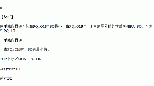 如图,OP平分∠MON,PA⊥ON于点A,点Q是射线OM上的一个动点,若PA=4,则PQ的最小值为( )