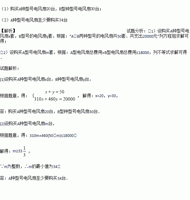 (2)若购买A,B两种型号的电风扇共50台,且支出不超过18000元,求A种型号电风扇至少要购买多少台?