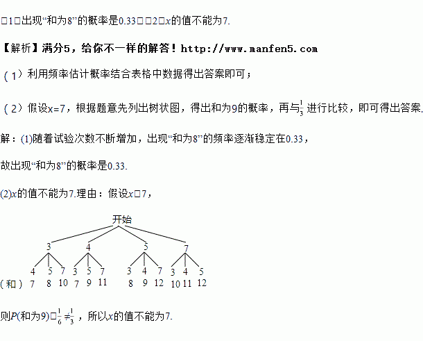 一只不透明的袋子中装有4个质地、大小均相同的小球,这些小球分别标有3,4,5,x,甲,乙两人每次同时从袋中各随机取出1个小球,并计算2个小球上的数字之和.记录后将小球放回袋中搅匀,进行重复试验,试验数据如下表: