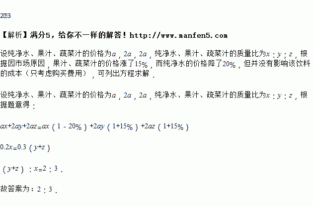 饮料由果汁、疏菜汁和纯净水按一定质量比配制而成,纯净水、果汁、蔬菜汁的价格比为1:2:2,因市场原因,果汁、蔬菜汁的价格涨了15%,而纯净水的价格降了20%,但并没有影响该饮料的成本(只考虑购买费用),那么该种饮料中果汁与蔬菜汁的质量和与纯净水的质量之比为________.