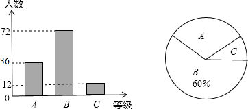 (2)总人数减去B、C等级人数可得A等级人数即可补全统计图;