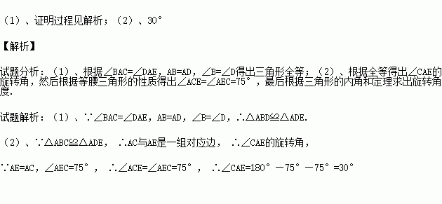 (2)如果∠AEC=75°,将△ADE绕点A旋转一个锐角后与△ABC重合,求这个旋转角的大小.