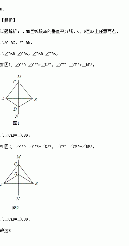已知MN是线段AB的垂直平分线,C、D是MN上任意两点,则∠CAD和∠CBD之间的大小关系是( )