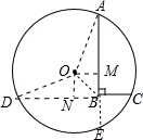 解答:解:延长AB、CB分别交⊙O于E、D,作OM⊥AB于M,ON⊥CD于N,连结OB、OA、OD,如图,设OM=a,ON=b,