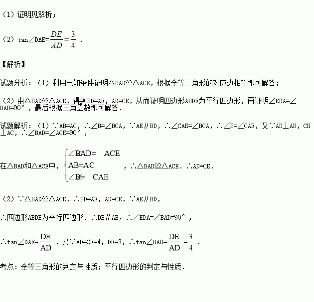 如图,在△ABC中,AB=AC,作AD⊥AB交BC的延长线于点D,作CE⊥AC,且使AE∥BD,连结DE.