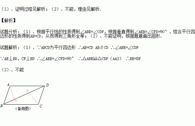 (2)若AE=CF,能否说明BE=DF?若能,请说明理由;若不能,请画出反例.