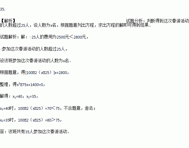 春游活动结束后,该班共支付给该旅行社活动费用2800元,请问该班共有多少人参加这次春游活动?