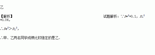 甲、乙两名同学投掷实心球,每人投10次,平均成绩为18米,方差分别为S甲2=0.1,S乙2=0.04,成绩比较稳定的是__(填“甲”或“乙”).